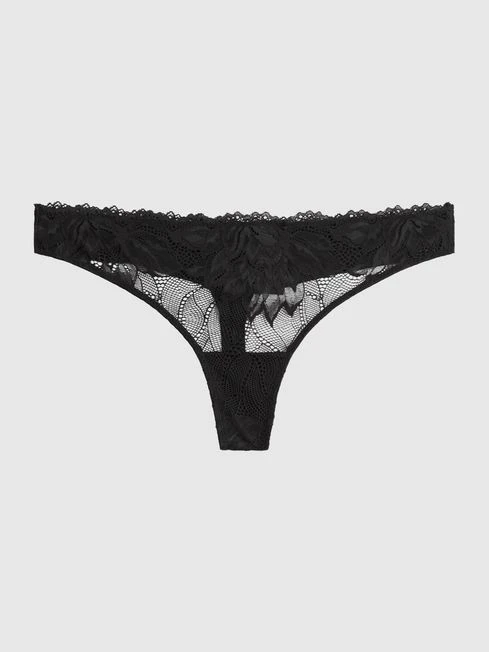 The Lace Thong in black is a bestseller for the brand, owing to its delicate sheer lace and microfibre composition. It’s cut to a medium rise on the waist with a close fit that lends a seductive comfort to your everyday base layer. A lace trim accents the elastic waistband, alongside a metal Calvin Klein tag that’s featured for enduring style. Finish the look with the matching lace plunge bra. Sheer lace and microfibre blend.
