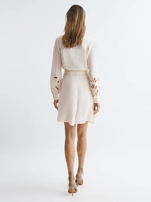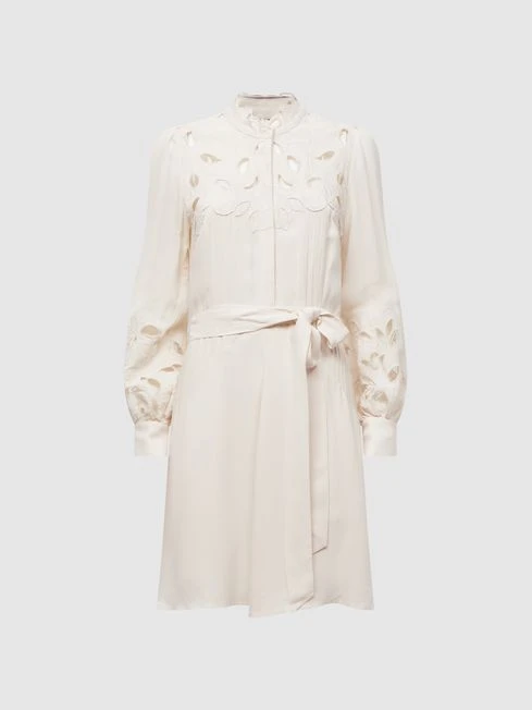 The ivory Clara mini dress is a feminine pick, characterised by cut-out lace detailing. Its fluid shape is cinched at the waist with an adjustable belt, highlighting the figure. Button up as required to suit your mood, then choose heels to heighten the look.