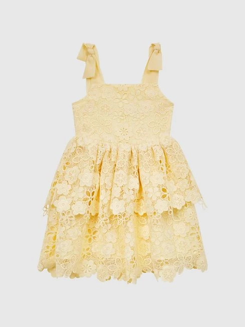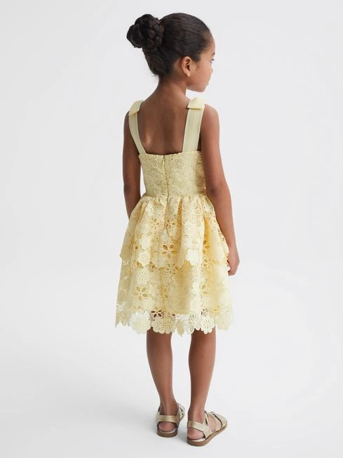 Cut in an on-trend square neckline, the Bethany dress is a must-have for special occasions. It’s crafted from a delicate floral lace fabrication and features bow detailing to the shoulder straps for a feminine touch. The layered skirt sits above the knee, adding volume and movement. Pair with her best dress shoes to complete the look.