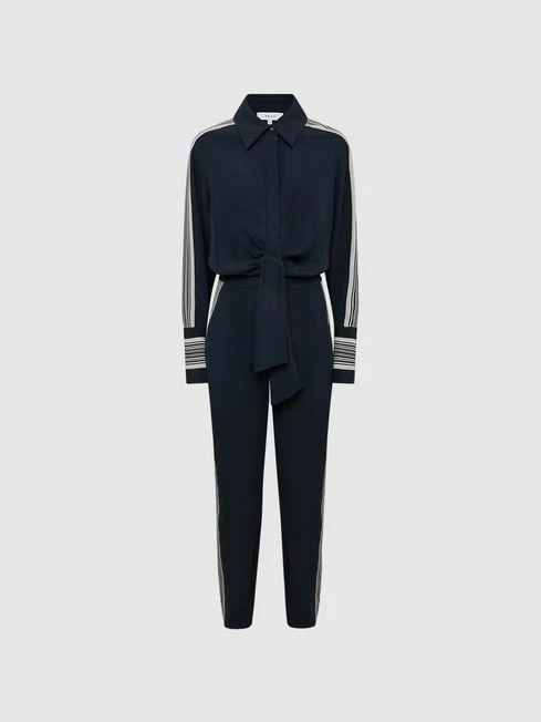Add a contemporary twist to your occasionwear wardrobe with the navy Selma jumpsuit. It’s crafted with a point collar and a tie detail to the waist. An intricate striped design is featured to add nuance to the piece. Style with heels to elongate the profile.