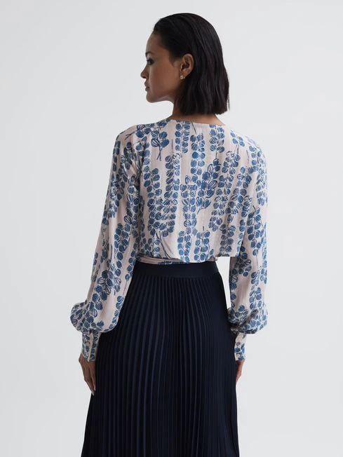 Reiss Pink/Blue Sadie Cropped Printed Belted Blouse