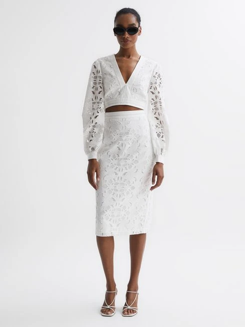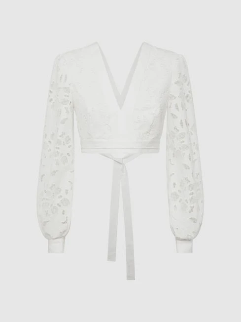 The Immi cropped blouse in white gives a feminine touch to your occasionwear rotation. It’s crafted from 100% cotton into a lace design and it’s cut with an alluring deep V-neckline. A waist tie is added to cinch the profile, further refining the look. Opt for the coordinating skirt, or pair with plain, high-rise trousers to make this top the centre piece.